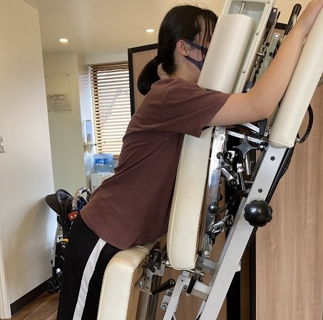 カイロプラクティック専用ハイローテーブルでお腹を圧迫させずに自動でうつ伏せになることができます。もちろんずっとこの姿勢で施術を続けるわけではござません。